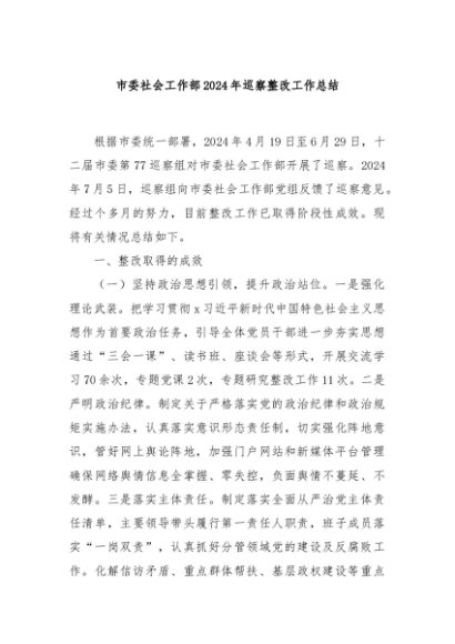 / 【七哥公文】2024年:市委社会工作部2024年巡察整改工作总结+更多免费公文+VX:QiGeGongWen2024