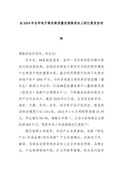 【七哥公文】2024年:在2024年全市电子商务高质量发展推进会上的汇报发言材料+更多免费公文+VX:QiGeGongWen2024