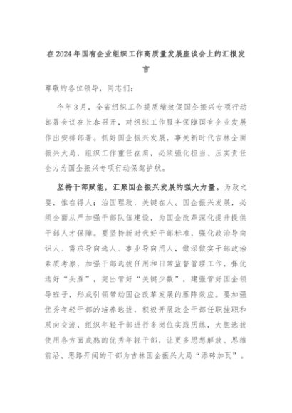 【七哥公文】2024年:在2024年国有企业组织工作高质量发展座谈会上的汇报发言+更多免费公文+VX:QiGeGongWen2024