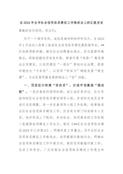 【七哥公文】2024年:在2024年全市社会信用体系建设工作推进会上的汇报发言+更多免费公文+VX:QiGeGongWen2024