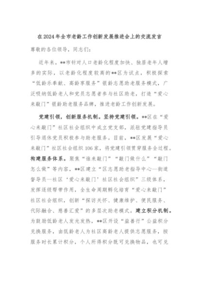 【七哥公文】2024年:在2024年全市老龄工作创新发展推进会上的交流发言+更多免费公文+VX:QiGeGongWen2024