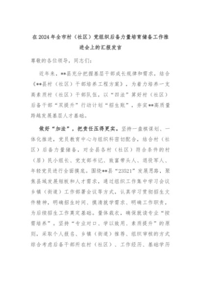 【七哥公文】2024年:在2024年全市村(社区)党组织后备力量培育储备工作推进会上的汇报发言+更多免费公文+VX:QiGeGongWen2024