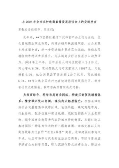 【七哥公文】2024年:在2024年全市农村电商直播发展座谈会上的交流发言+更多免费公文+VX:QiGeGongWen2024