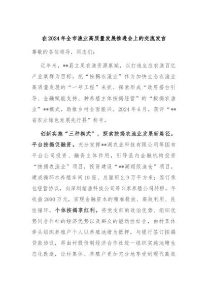 / 【七哥公文】2024年:在2024年全市渔业高质量发展推进会上的交流发言+更多免费公文+VX:QiGeGongWen2024