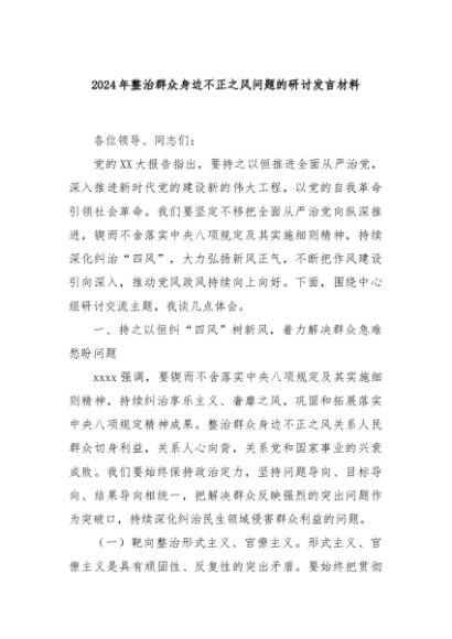 / 【七哥公文】2024年:2024年整治群众身边不正之风问题的研讨发言材料+更多免费公文+VX:QiGeGongWen2024