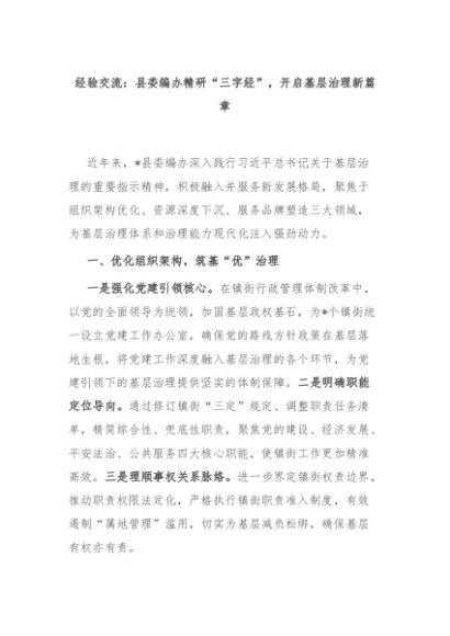【七哥公文】2024年:经验交流:县委编办精研“三字经”,开启基层治理新篇章+更多免费公文+VX:QiGeGongWen2024