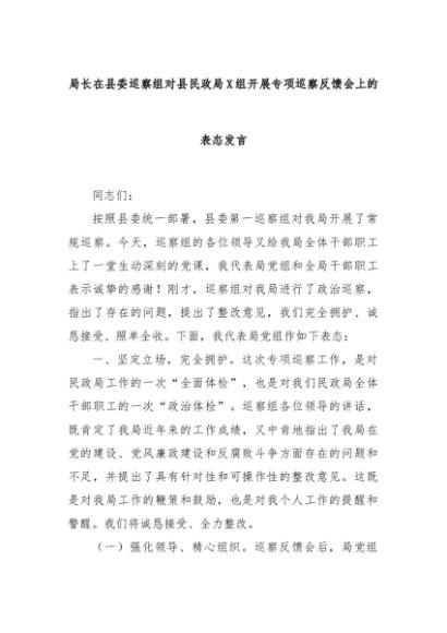 【七哥公文】2024年:局长在县委巡察组对县民政局X组开展专项巡察反馈会上的表态发言+更多免费公文+VX:QiGeGongWen2024