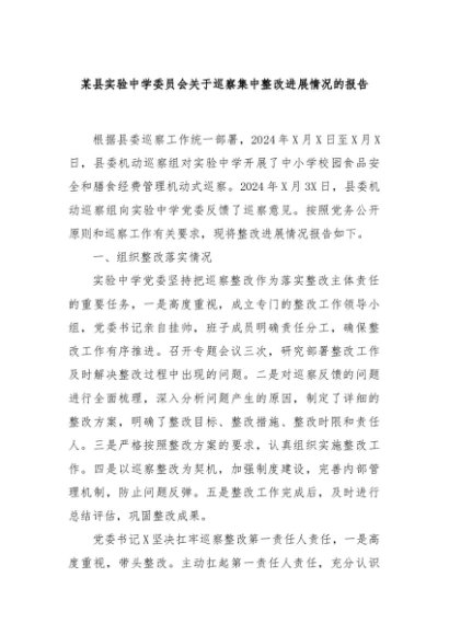/ 【七哥公文】2024年:某县实验中学委员会关于巡察集中整改进展情况的报告+更多免费公文+VX:QiGeGongWen2024
