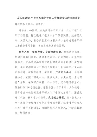 【七哥公文】2024年:某区在2024年全市离退休干部工作推进会上的交流发言+更多免费公文+VX:QiGeGongWen2024