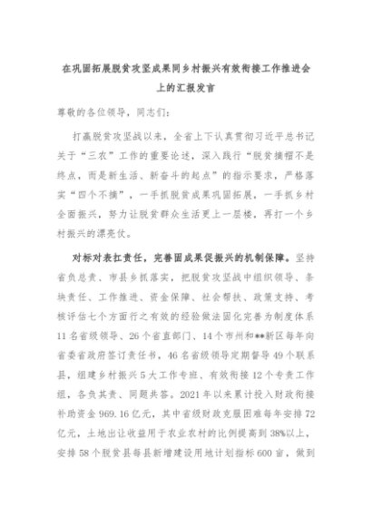 【七哥公文】2024年:在巩固拓展脱贫攻坚成果同乡村振兴有效衔接工作推进会上的汇报发言+更多免费公文+VX:QiGeGongWen2024