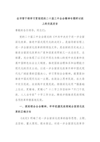 【七哥公文】2024年:在市管干部学习贯彻党的二十届三中全会精神专题研讨班上的交流发言+更多免费公文+VX:QiGeGongWen2024