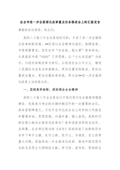 【七哥公文】2024年:在全市进一步全面深化改革重点任务推进会上的汇报发言+更多免费公文+VX:QiGeGongWen2024