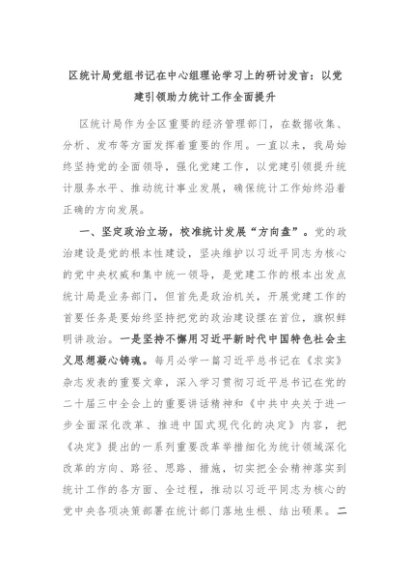 【七哥公文】2024年:区统计局党组书记在中心组理论学习上的研讨发言:以党建引领助力统计工作全面提升+更多免费公文+VX:QiGeGongWen2024