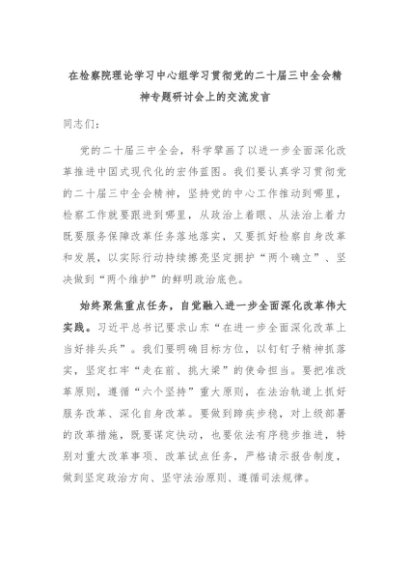【七哥公文】2024年:在检察院理论学习中心组学习贯彻党的二十届三中全会精神专题研讨会上的交流发言+更多免费公文+VX:QiGeGongWen2024