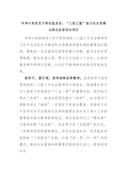 【七哥公文】2024年:市审计局党员干部交流发言:“三抓三重”助力机关党建与深化改革同向同行+更多免费公文+VX:QiGeGongWen2024