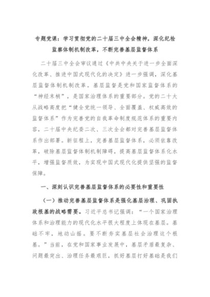 【七哥公文】2024年:专题党课:学习贯彻党的二十届三中全会精神,深化纪检监察体制机制改革,不断完善基层监督体系+更多免费公文+VX:QiGeGongWen2024
