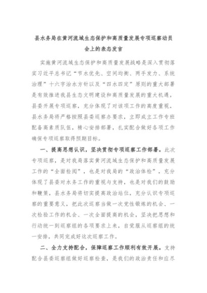 【七哥公文】2024年:县水务局在黄河流域生态保护和高质量发展专项巡察动员会上的表态发言+更多免费公文+VX:QiGeGongWen2024