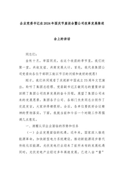 【七哥公文】2024年:企业党委书记在2024年国庆节座谈会暨公司改革发展推进会上的讲话+更多免费公文+VX:QiGeGongWen2024