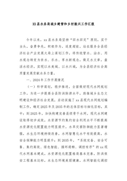 / 【七哥公文】2024年:XX县水务局城乡建管和乡村振兴工作汇报+更多免费公文+VX:QiGeGongWen2024