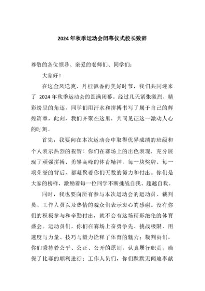 【七哥公文】2024年:2024年秋季运动会闭幕仪式校长致辞+更多免费公文+VX:QiGeGongWen2024