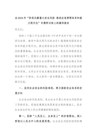 【七哥公文】2024年:在2024年“防范化解重大安全风险 推进应急管理体系和能力现代化”专题研讨班上的辅导报告+更多免费公文+VX:QiGeGongWen2024