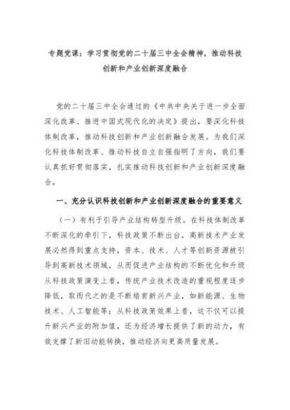 【七哥公文】2024年:专题党课:学习贯彻党的二十届三中全会精神,推动科技创新和产业创新深度融合+更多免费公文+VX:QiGeGongWen2024