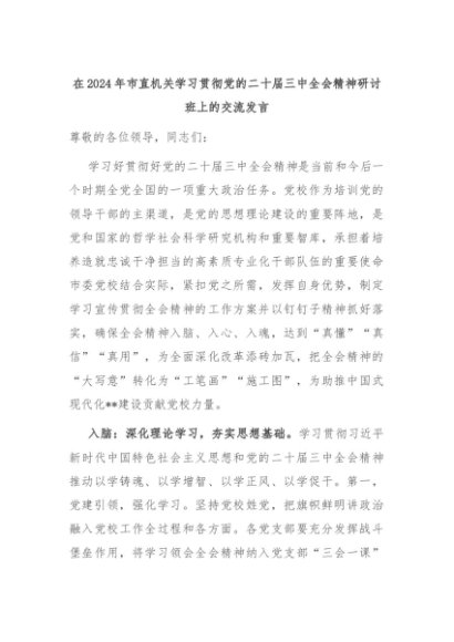 【七哥公文】2024年:在2024年市直机关学习贯彻党的二十届三中全会精神研讨班上的交流发言+更多免费公文+VX:QiGeGongWen2024
