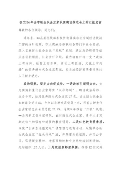 【七哥公文】2024年:在2024年全市新生代企业家队伍建设推进会上的汇报发言+更多免费公文+VX:QiGeGongWen2024