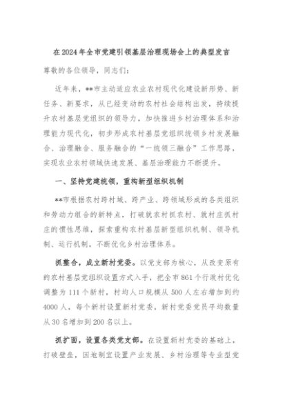 【七哥公文】2024年:在2024年全市党建引领基层治理现场会上的典型发言+更多免费公文+VX:QiGeGongWen2024