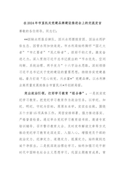【七哥公文】2024年:在2024年市直机关党建品牌建设推进会上的交流发言+更多免费公文+VX:QiGeGongWen2024