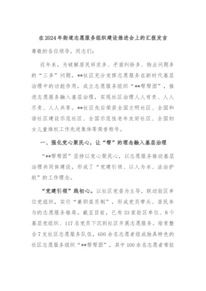 【七哥公文】2024年:在2024年街道志愿服务组织建设推进会上的汇报发言+更多免费公文+VX:QiGeGongWen2024