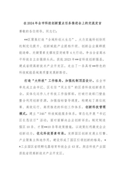 【七哥公文】2024年:在2024年全市科技创新重点任务推进会上的交流发言+更多免费公文+VX:QiGeGongWen2024
