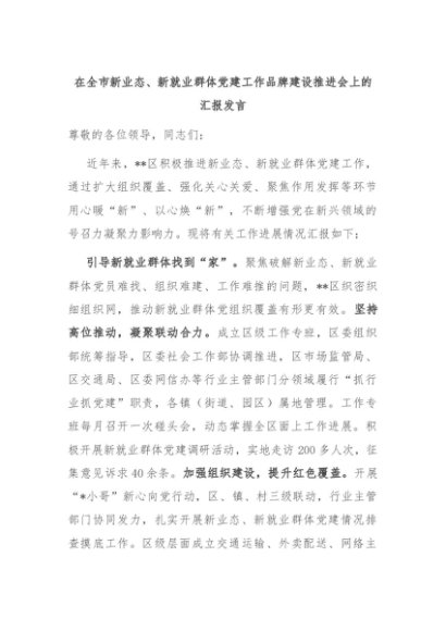 【七哥公文】2024年:在全市新业态、新就业群体党建工作品牌建设推进会上的汇报发言+更多免费公文+VX:QiGeGongWen2024