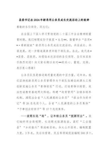 【七哥公文】2024年:县委书记在2024年新录用公务员成长交流活动上的致辞+更多免费公文+VX:QiGeGongWen2024