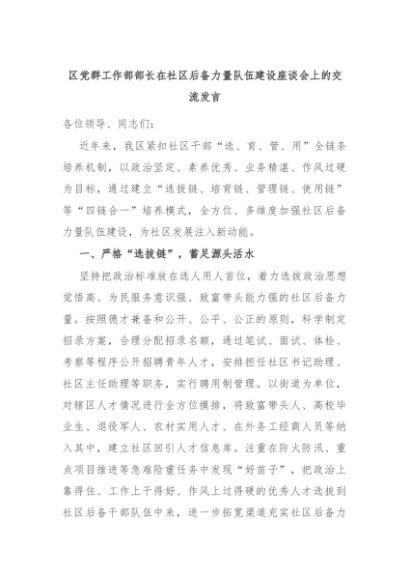 【七哥公文】2024年:区党群工作部部长在社区后备力量队伍建设座谈会上的交流发言+更多免费公文+VX:QiGeGongWen2024