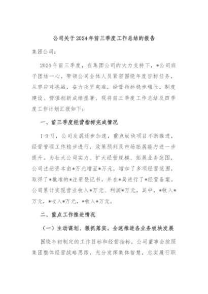 / 【七哥公文】2024年:公司关于2024年前三季度工作总结的报告+更多免费公文+VX:QiGeGongWen2024