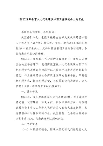 【七哥公文】2024年:在2024年全市人大代表建议办理工作推进会上的汇报+更多免费公文+VX:QiGeGongWen2024