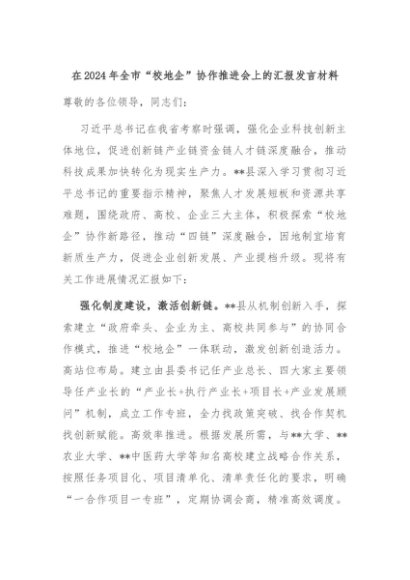 【七哥公文】2024年:在2024年全市“校地企”协作推进会上的汇报发言材料+更多免费公文+VX:QiGeGongWen2024
