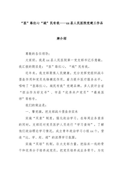 【七哥公文】2024年:“医”路红心“城”民有我——xx县人民医院党建工作品牌介绍+更多免费公文+VX:QiGeGongWen2024