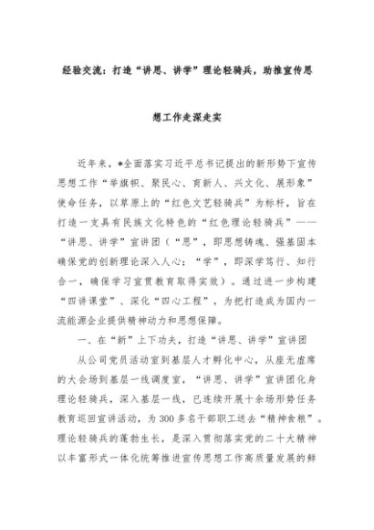 【七哥公文】2024年:经验交流:打造“讲思、讲学”理论轻骑兵,助推宣传思想工作走深走实+更多免费公文+VX:QiGeGongWen2024