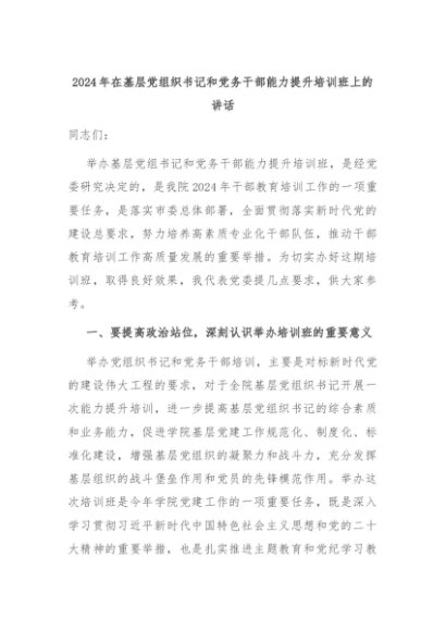 【七哥公文】2024年:2024年在基层党组织书记和党务干部能力提升培训班上的讲话+更多免费公文+VX:QiGeGongWen2024