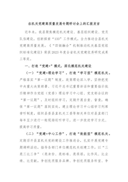 / 【七哥公文】2024年:在机关党建高质量发展专题研讨会上的汇报发言+更多免费公文+VX:QiGeGongWen2024
