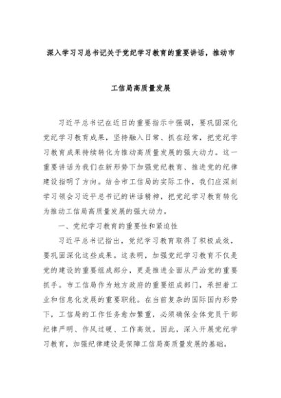 【七哥公文】2024年:深入学习习总书记关于党纪学习教育的重要讲话,推动市工信局高质量发展+更多免费公文+VX:QiGeGongWen2024