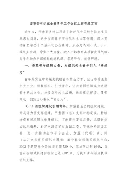 / 【七哥公文】2024年:团市委书记在全省青年工作会议上的交流发言+更多免费公文+VX:QiGeGongWen2024