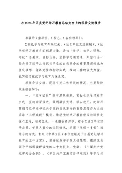 【七哥公文】2024年:在2024年区委党纪学习教育总结大会上的经验交流报告+更多免费公文+VX:QiGeGongWen2024