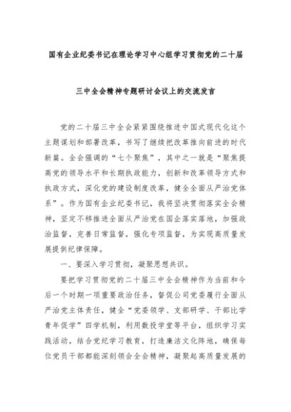 【七哥公文】2024年:国有企业纪委书记在理论学习中心组学习贯彻党的二十届三中全会精神专题研讨会议上的交流发言+更多免费公文+VX:QiGeGongWen2024
