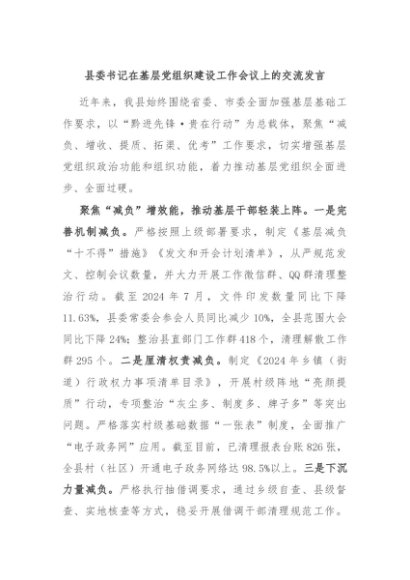 【七哥公文】2024年:县委书记在基层党组织建设工作会议上的交流发言+更多免费公文+VX:QiGeGongWen2024