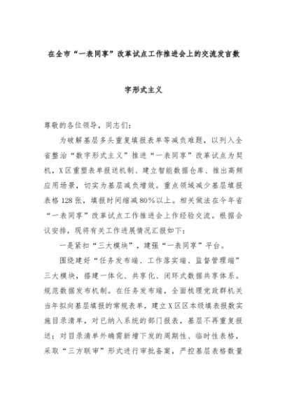 【七哥公文】2024年:在全市“一表同享”改革试点工作推进会上的交流发言数字形式主义+更多免费公文+VX:QiGeGongWen2024