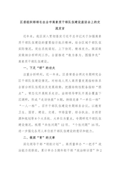 【七哥公文】2024年:区委组织部部长在全市高素质干部队伍建设座谈会上的交流发言+更多免费公文+VX:QiGeGongWen2024