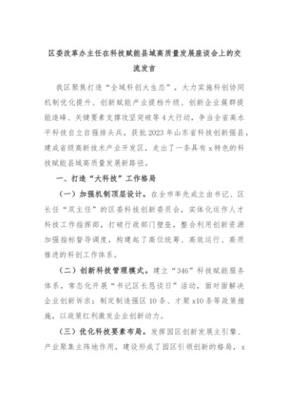 【七哥公文】2024年:区委改革办主任在科技赋能县域高质量发展座谈会上的交流发言+更多免费公文+VX:QiGeGongWen2024